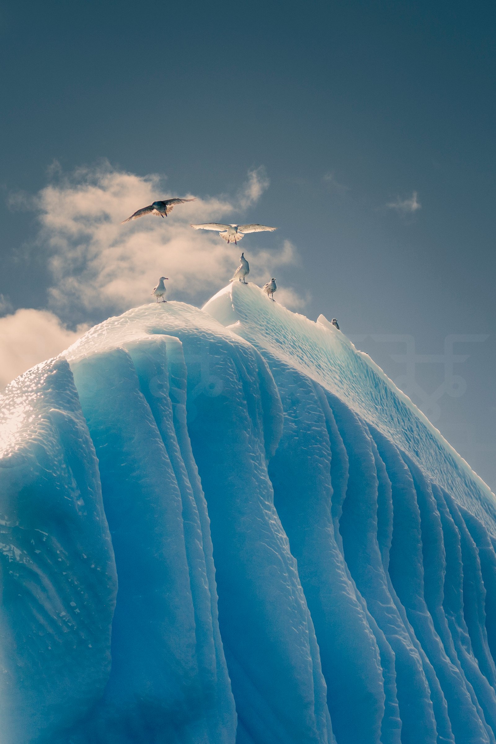 Vogels rusten uit op een helder blauwe ijsberg voor de kust van Newfoundland, Canada. Het zonlicht maakt het blauw/turquoise nog eens extra intens. ‘Ice cold blue’ is onderdeel van de Stillness collectie: natuur-, wildlife- en landschapsbeelden gemaakt als blikvanger aan de muur, thuis of op kantoor.